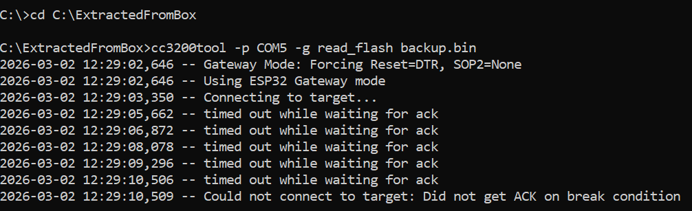 I’m struggling to get a flash backup from my Toniebox. Despite trying multiple configurations and hardware setups, I keep getting the timed out while waiting for ack / Did not get ACK on break condition error.